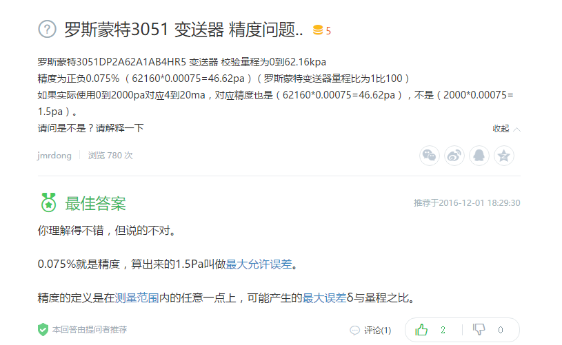 1、羅斯蒙特3051 變送器 精度問題(羅斯蒙特3051DP2A62A1AB4HR5 變送器 校驗(yàn)量程為0到62.16kpa精度為正負(fù)0.075% (62160*0.00075=46.62pa)(羅斯蒙特變送器量程比為1比100)如果實(shí)際使用0到2000pa對(duì)應(yīng)4到20ma,對(duì)應(yīng)精度也是(62160*0.00075=46.62pa),不是(2000*0.00075=1.5pa)。請(qǐng)問是不是?請(qǐng)解釋一下)
