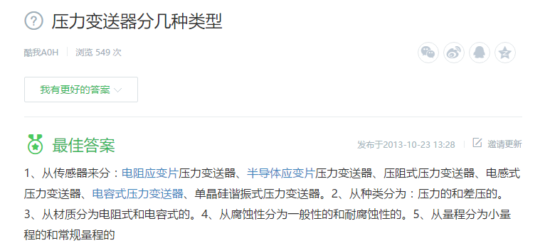 1、從傳感器來分:電阻應變片壓力變送器、半導體應變片壓力變送器、壓阻式壓力變送器、電感式壓力變送器、電容式壓力變送器、單晶硅諧振式壓力變送器。2、從種類分為:壓力的和差壓的。3、從材質分為電阻式和電容式的。4、從腐蝕性分為一般性的和耐腐蝕性的。5、從量程分為小量程的和常規量程的。