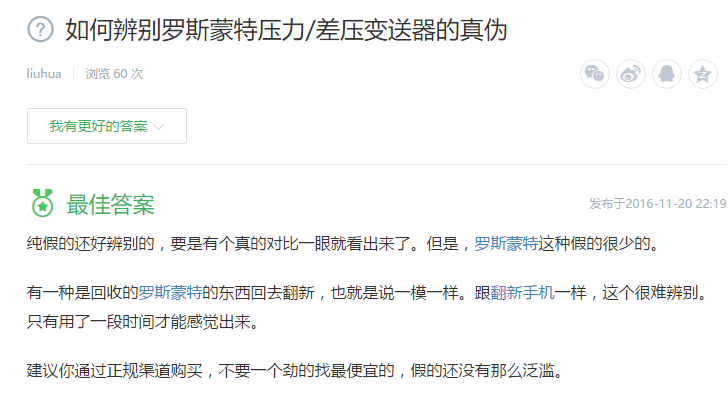 純假的還好辨別的,要是有個真的對比一眼就看出來了。但是,羅斯蒙特這種假的很少的。有一種是回收的羅斯蒙特的東西回去翻新,也就是說一模一樣。跟翻新手機一樣,這個很難辨別。只有用了一段時間才能感覺出來。建議你通過正規渠道購買,不要一個勁的找最便宜的,假的還沒有那么泛濫。