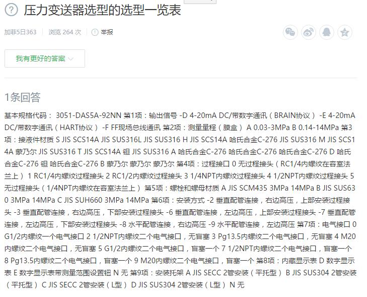 壓力變送器選型的選型一覽表